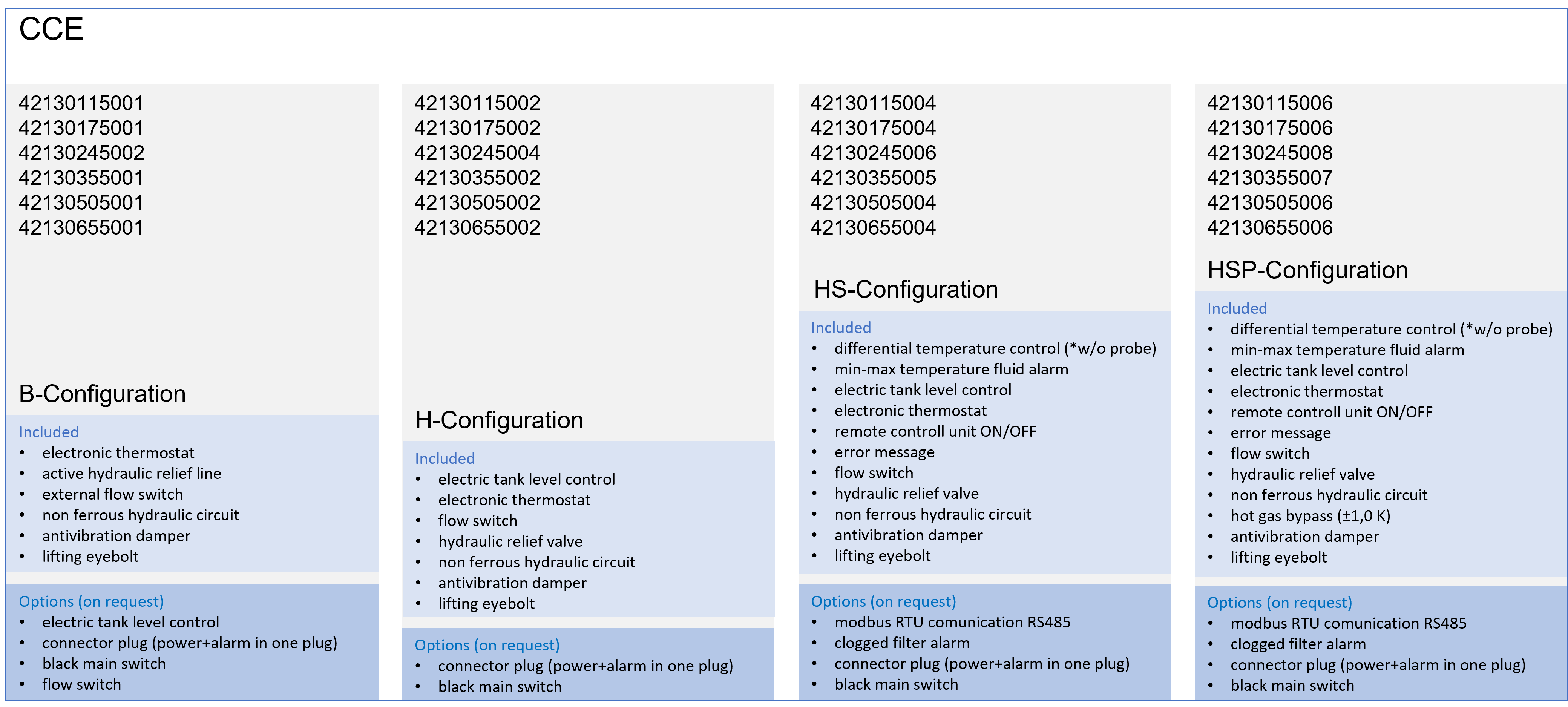 - differential temperature control (*w/o probe), min-max temperature fluid alarm, electric level, electronic thermostat, remote control unit ON/OFF, error message, flow switch, hydraulic relief valve, non ferrous hydraulic circuit, antivibration damper, lifting eyebolt