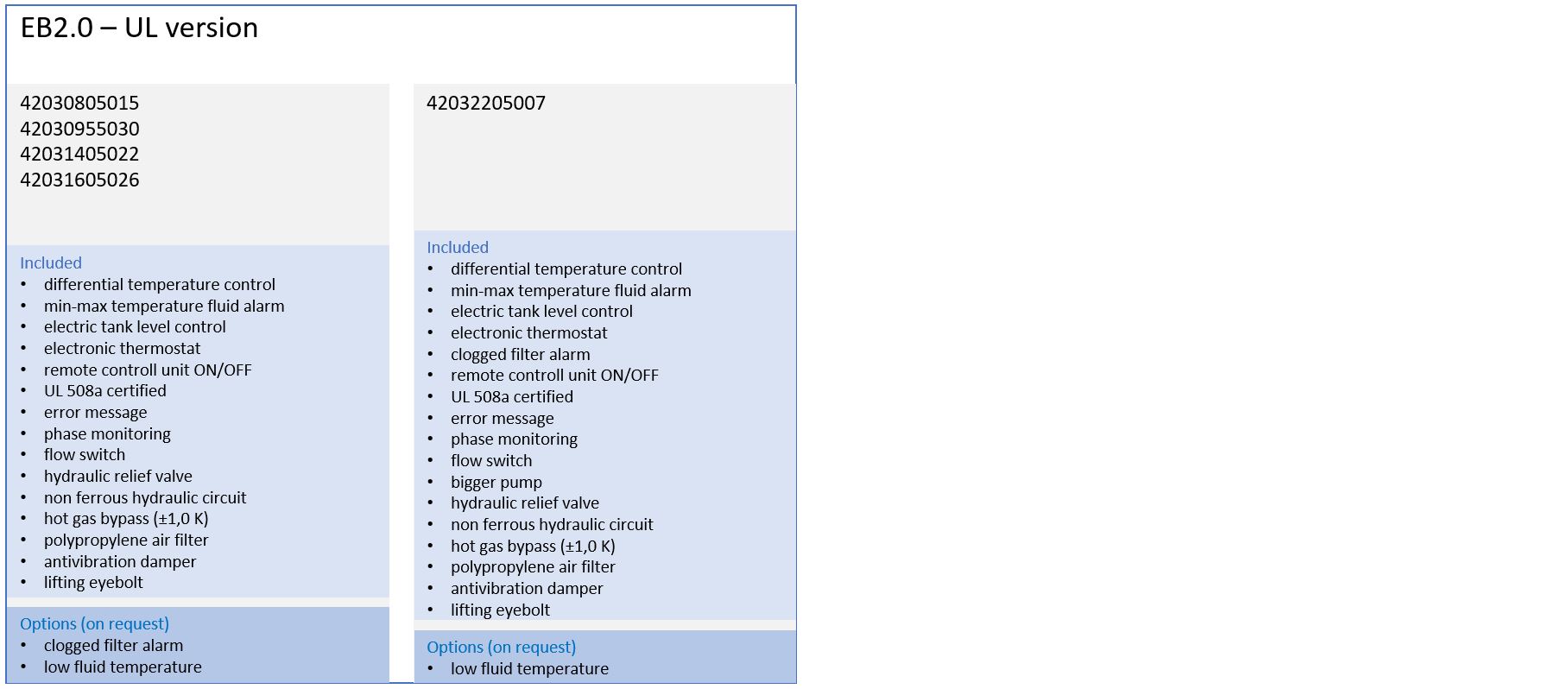 - differential temperature control (*w/o probe), min-max temperature fluid alarm, electric tank level control, electronic thermostat, remote control unit ON/OFF, UL 508a certified, error message, phase monitoring, flow switch, hydraulic relief valve, non ferrous hydraulic circuit, hot gas bypass (±1,0K), polypropylene air filter, antivibration damper, lifting eyebolt