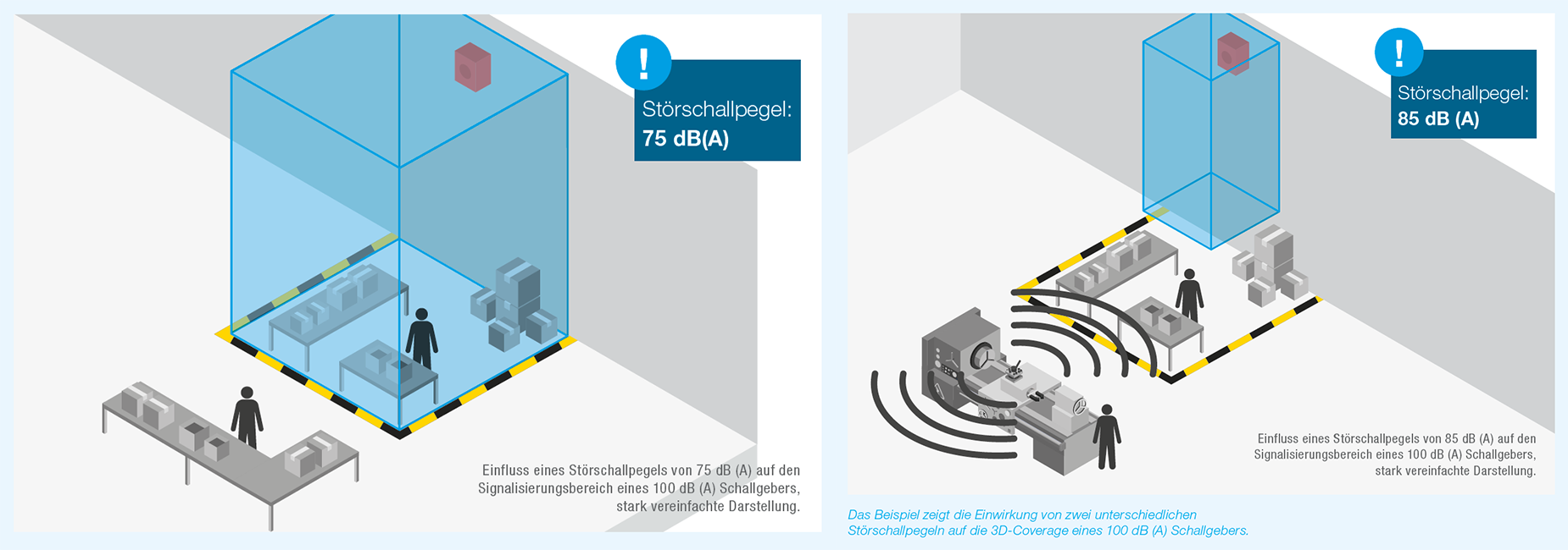 Im Allgemeinen wird bei der Planung akustischer Signale davon ausgegangen, dass die Lautstärke eines Schallgebers das einzige Auswahlkriterium ist. Diese Annahme ist jedoch nicht richtig: In Produktionsanlagen, Gebäuden und allen anderen öffentlichen Bereichen können eine Vielzahl von Faktoren, wie z.B. die Frequenz des Umgebungslärms, isolierte Wände oder Schutzeinrichtungen wie z.B. Gehörschutz die Wahrnehmbarkeit von akustischen Signalen beeinträchtigen. Daher muss ein akustisches Schallsystem nicht nur eine gewisse Lautstärke erreichen, sondern auch in der Lage sein, bestimmte Frequenzbereiche bei der Schallerzeugung abzudecken. Es muss sichergestellt werden, dass dieser Schall für das menschliche Ohr effektiv wahrnehmbar und vom Umgebungslärm deutlich unterscheidbar ist.