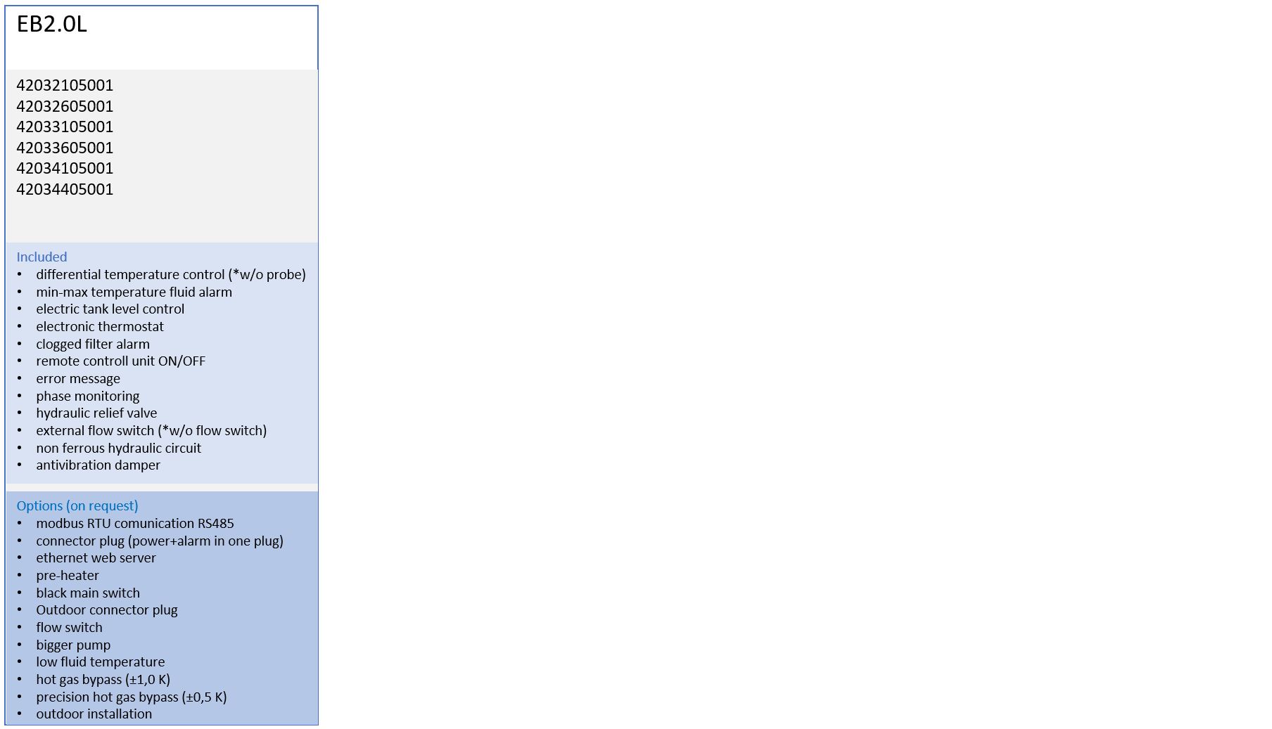 - differential temperature control (*w/o probe), min-max temperature fluid alarm, electric tank level control, electronic thermostat, clogged filter alarm, remote control unit ON/OFF, error message, phase monitoring, hydraulic relief valve, external flow switch (*w/o flow switch), non ferrous hydraulic circuit, antivibration damper